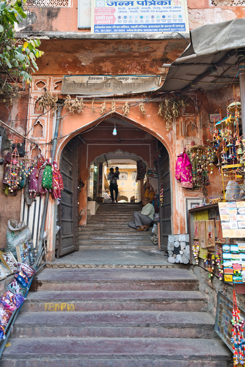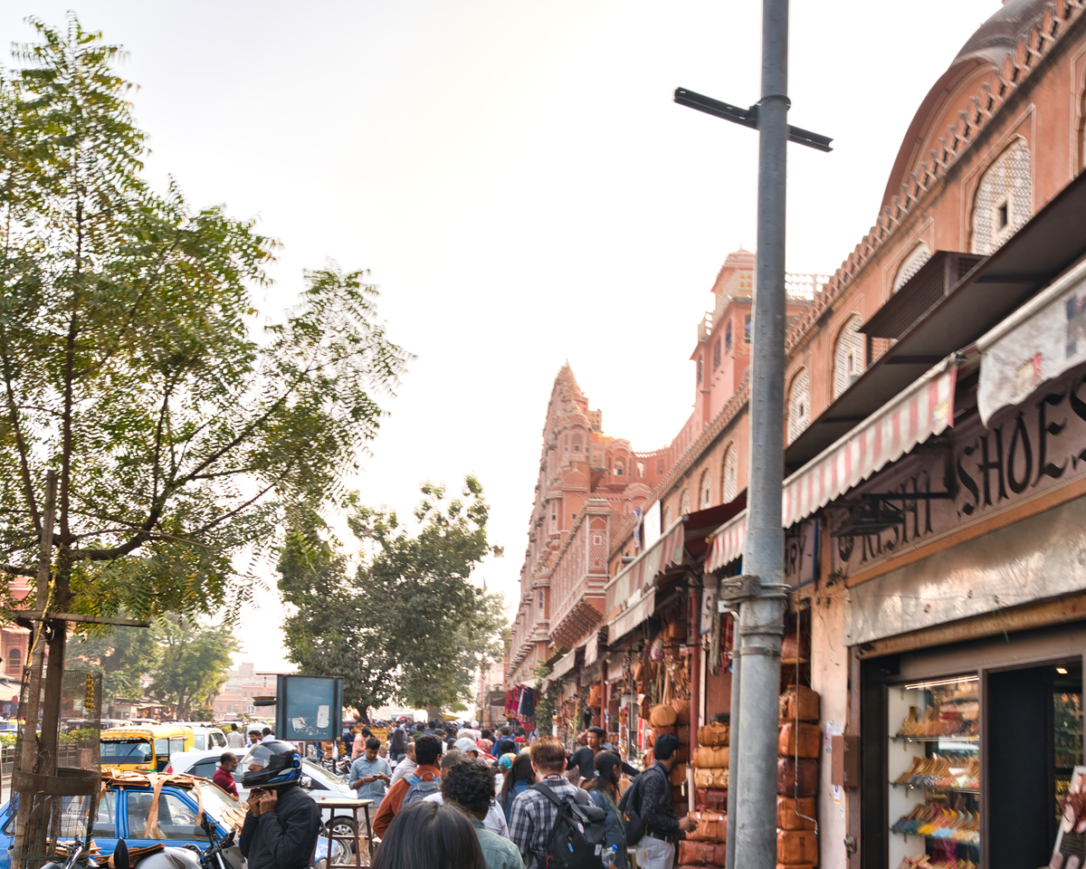 建物の周りはバザーをやっている様な繁華街で雑貨なども売っています。写真はハワー・マハルの道路向かいの建物ですが、一階に沢山の店があるのが分かります。また、建物も先ほど書いたピンクの外壁を見ることができます。窓の意匠なども可愛らしいデザインです。意外と大きな木も生えています。