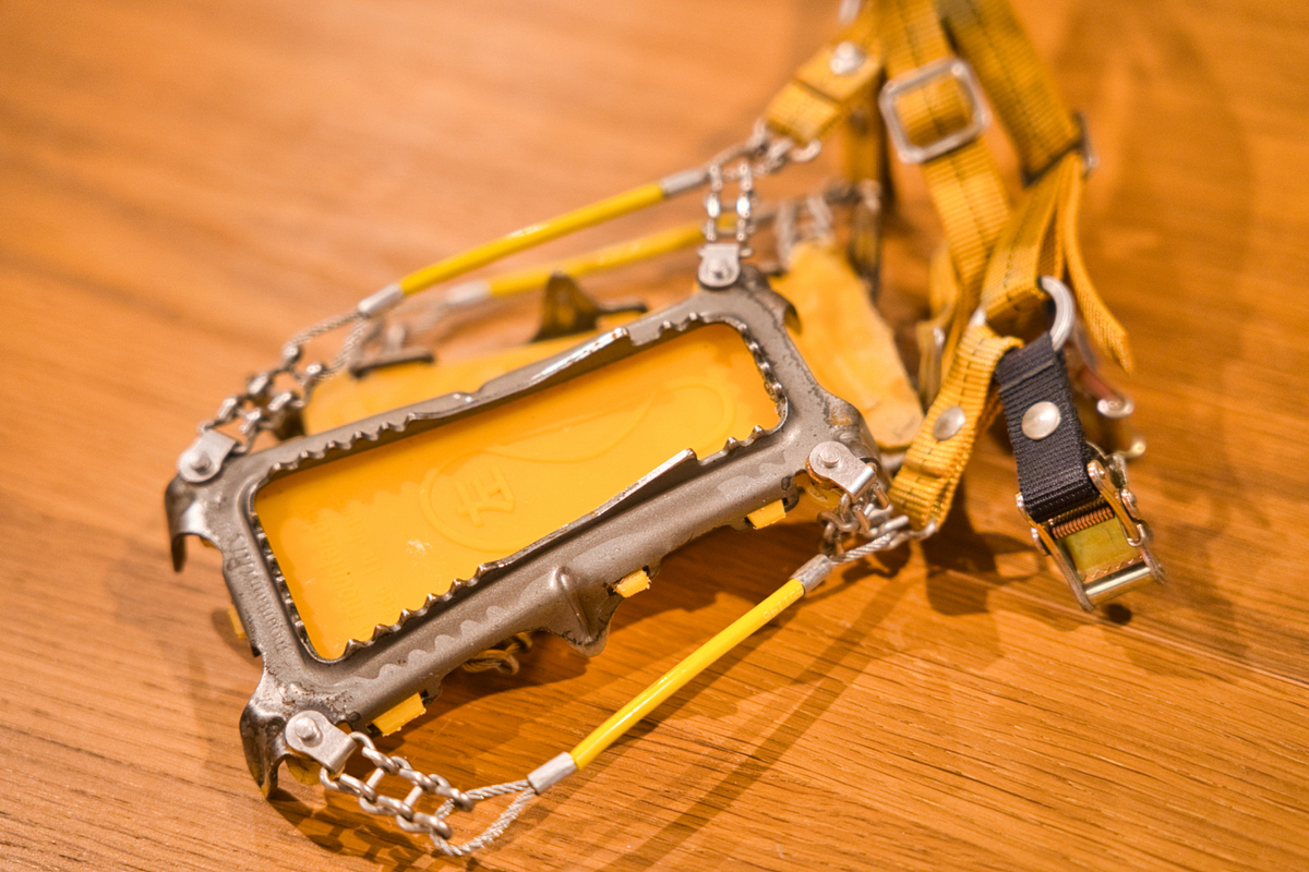 あまりの衝撃でカタコトになってしまいました。今日は山道具の話になるのですが、題名の通り愛用の軽アイゼンが壊れてしまいました。アイゼンというのは、雪山を登る時に登山靴の下に履くものです。冬の登山では必需品なのです。その中でも軽アイゼンとは下の写真のような爪が少ないモノで、登山コースに急斜面がなくて前爪が必要ない時に使います。12本爪のアイゼンは重たく専用の登山靴も必要になるので山行によって使い分ける感じです。ざっくりですが6本爪以下(メーカによっては10本爪もあるようですが…)を軽アイゼンと呼んでいます。各メーカーより様々な軽アイゼンが出ているのですが、私はこの黄色が映えるマウンテンダックスを使用しています。
