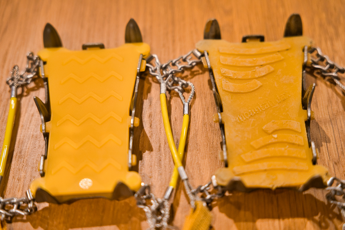 使用上に影響があるかもと思うところが1箇所ありまして、上の写真の左が新型で右が旧型になります。違いが分かりますか?登山靴に固定する時に重要なチェーンが3つから4つに変更になっていました。ここに関しては、買う前に教えて欲しかった部分です。実際に使ってみたのですが、やはり登山靴に固定するポジションが微妙に変わるので気になる人は、気になってしまうのではないかと思います。ちなみに、私は最初は気になっていたのですが歩いている内に忘れていました…まったく鈍感な人間です。もし交換修理を検討中の方は気をつけてください。足に関わるところは登山の場合は、一番稼働する需要な箇所なので参考になれば!