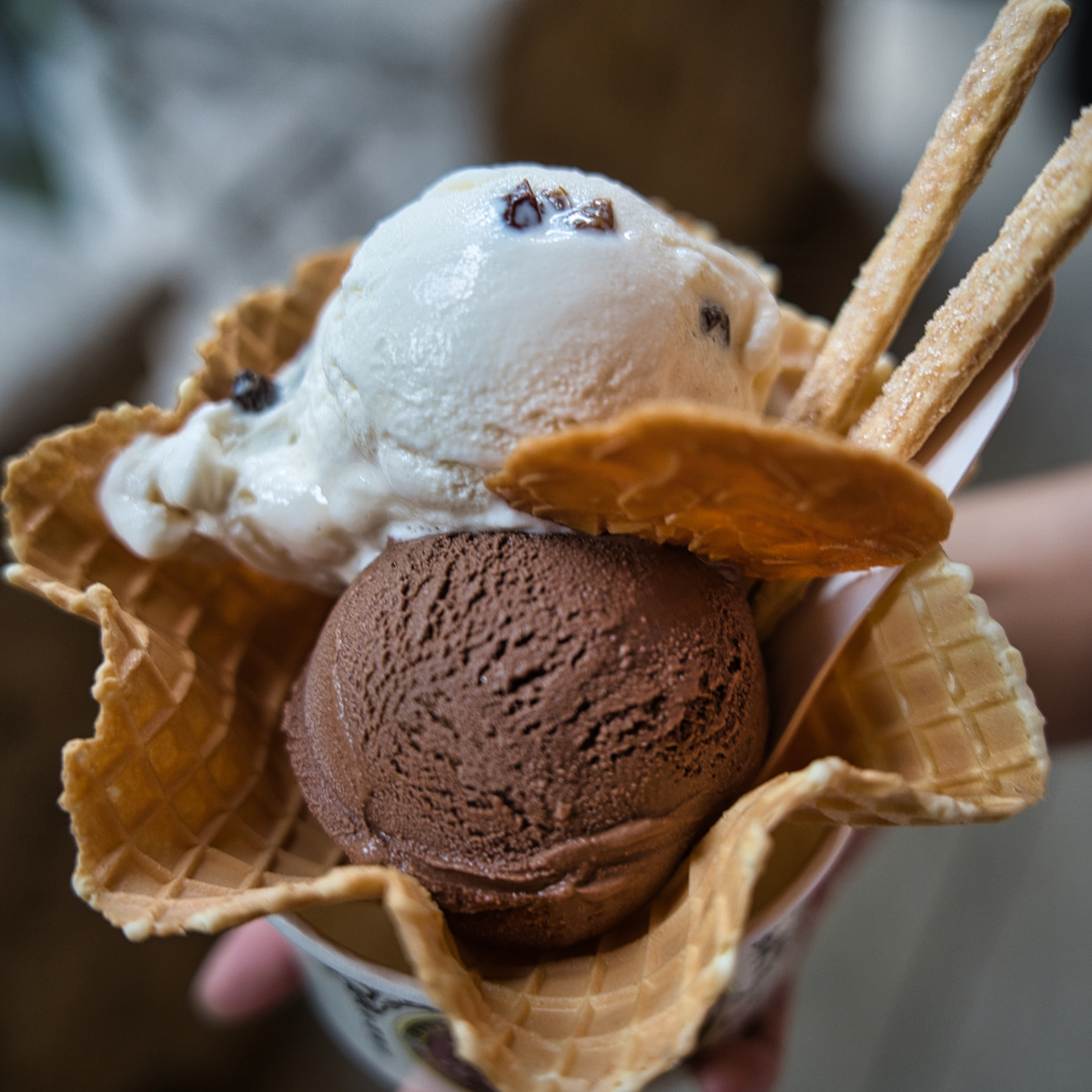 前二つの写真は、宮原眼科です。今一番映えスポットではないでしょうか?眼科と書いていますが、眼科だった建物を大幅にリノベーションしたアイスクリームとお土産菓子のお店です。アイスクリームは確かに美味しかったです。写真で見ると渋めなセレクトでしたが、レーズンマスカルポーネとチョコレート(ベネズエラだった気が…)のダブルでワッフルボールです。茶色ベースで映えていない…おかしい…誰でも映えるんじゃないのか?…おじさんはダメなのか🤔